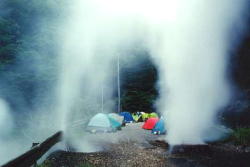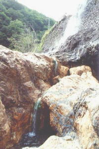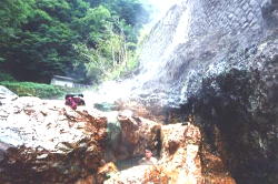 水蒸気爆発のあった旧中の湯の手前のトンネル横です。 赤怒谷トンネルの手前(松本側)で左の道へ入ると(チェーンが張られています)水蒸気がもうもうと出ている場所があります。 ここは間欠泉になっていて突然湯が噴き出ることがあります。 依然は写真のように湯が窪みにたまりすばらしい温泉になっていたのですが現在はコンクリートで埋められています。 残念。 |