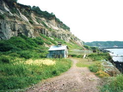 登別の海岸の崖上に立っている掘っ建て小屋の温泉。