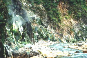 谷底まで下りると何やら臭います。あたりは 湯が至る所から湧き出ています。 特にこの噴泉塔は3mくらいはありそうです。 |