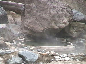 | 左手の大きな溜りも温泉です。 ここはかなり熱いです。 こんなに大きな湯船は今までここでは見たことがありません。 |