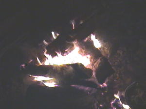 | 夜の冷え込みは厳しく たき火で寒さをしのぎます。 ちなみに車中泊でしたが 車内の気温は明け方でマイナス2.4℃でした。翌日飲み水のタンクの中は凍っていました。 |