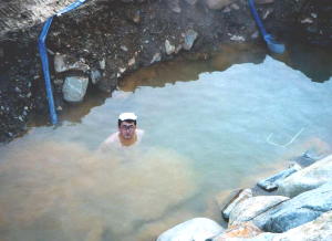 地獄谷温泉入り口の護岸工事現場に湯が溜まってい