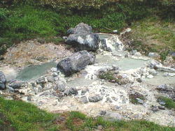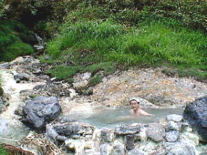 結局歩き約20分、距離約1200mで草の湯に到着です。 ここは硫黄の採取場になっているそうです。 少し温めですが 火照った体にはちょうどいい湯加減です。 アブに注意。 2匹叩き落としました。 |