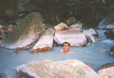 沢の上流は温泉ホテルの源泉地帯。 沢全体が湯船となる。