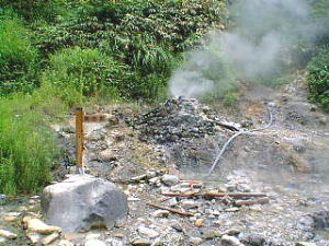 ここ(紫地獄)で地元の人が山菜を茹でていました。 20分ほどで茹で上がるそうです。 実際この近くには”わらび地獄”というのがありました。 実際昔の人たちがわらびを茹でるのに利用していたそうです。 |