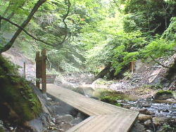 沸いている湯が遊歩道の下へ回り込み川へと流れて行きます。 |