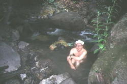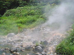紫地獄と呼ばれるところです。 熱湯が勢い良く沸いています。 ここは川の水とうまく合わせれば入浴可能です。 |