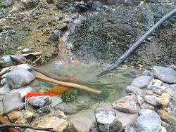 岩の割れ目から湯が沸いています。 こんなのが突然噴くと恐いですね。 |