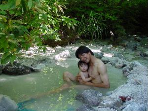 組長のだんな様と次男でしゅ。 野湯は初めての経験かな? 湯加減はどうでしゅか? |