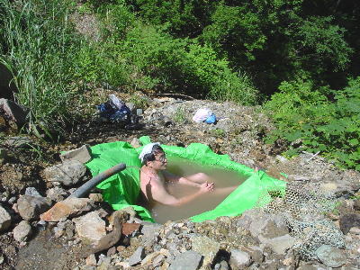 とある温泉の裏山にある源泉地帯。 余った湯がドバドバ溢れている。 ドカシーに溜めて快適入浴。