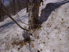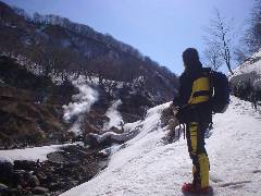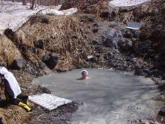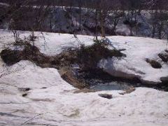 と、いうわけで湯の誘惑に負けて入浴です。 ここで小1時間過ごすハメになりました。 夏場は熱くて入ることが出来ないそうです。 また、場所も笹に覆われてわかりません。 (97年夏にこの横を歩いたはずなんですが・・・) 雪のおかげでめでたく入湯です。 |
