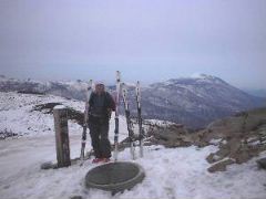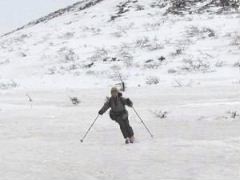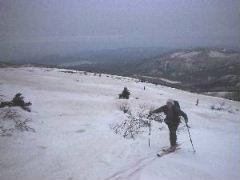 爽快な山頂からの滑降です。 この快楽のために登ってるのです。 いまどきの滑りでないのがちと悲しい・・・ |