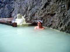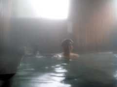 その後この2日間のベースを温泉付きの松川の自然休養林キャンプ場に決め、設営後近くの松楓荘へ。 ただ、5時から女性タイムの洞窟風呂。 着いたのは4時45分。急げ〜! |