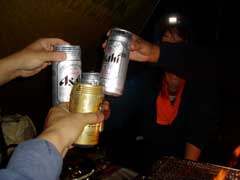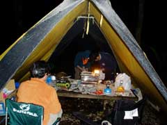 キャンプ場に戻り食事の準備。 自立タープをサイト横のテーブルにかぶせ雨の中でも快適宴会のスタートです。 今回は4人で車1台、テント1張りと過去のキャンプでは考えられないものです。 今回は使ってない道具を使ったりとかこの夏残ったアルコールとか使い切りたいというのがひとつの目的なのでした。 |