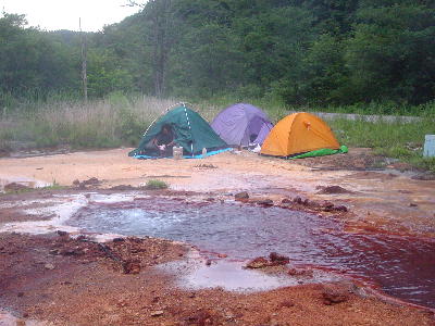 | このお盆の旅はここでI氏と合流しました。 彼は昼からテントを張って待っていたそうですがアブの攻撃はすごいものがあったそうです。 (暗くなってから到着した私はラッキーでした。 入浴も早朝に行いました。) |