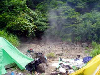 幕営地少し上の分岐です。 右の沢より白っぽい湯が・・・ 明日は左の沢を溯上します。 |