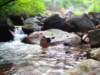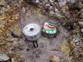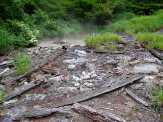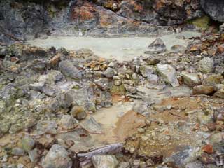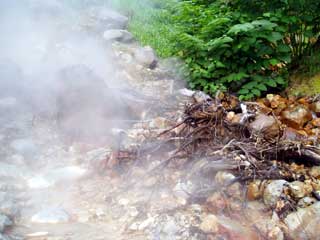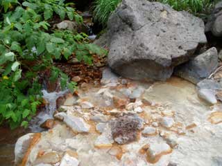 軽く昼飯をとった後上流散策。 いきなり源泉地帯。 熱い湯がゴボゴボと・・・ |
