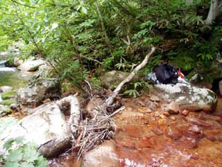 12:00 本日の幕営地へ到着。 昔の湯小屋跡です。 鍋、瓶等散乱していました。 かつてのマタギの小屋? 湯治場? ところで何処へ張るの??? |