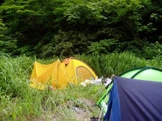 何とかテント5張り。 ところで8人なのに・・・ ちなみにこの日もオンドル状態。 私はツェルト。 張るや否やこおろぎ君とアリさんがいっぱい飛び込んできました。 |