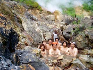 素晴らしい湯船。 で、皆で入ってしまいました。 (一人キャンプ地に居残り、かわいそう・・・) 極楽極楽! でもやっぱこの写真は変??? |