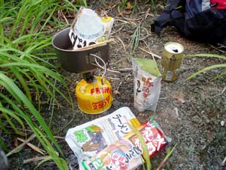 この日の晩はガスカートリッジ使用。 だって、少しでも荷物を軽くしたいんだもん・・・ アルコールタイムになって秘蔵のシュナップス(ウィリアムス)登場。 なんと、お湯割りで飲む人が・・・ クセになる味と言ってましたが・・・ ああ、お湯割りとは??? |