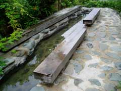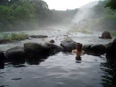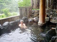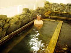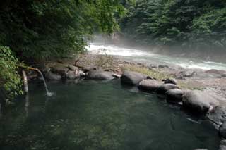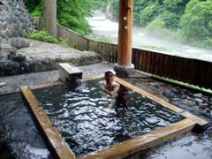 川沿いの野天風呂です。 温めでいい感じ。 透明で滑らかな湯です。 いくらでも入っていられそうです。 (立ち寄り湯は1時間でと言われました。) |