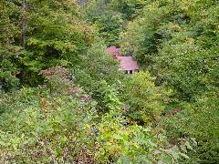 駐車場からか通常でも歩き20分というのですがこの時一番下まで乗せて貰えました。 赤い屋根が見えます。 |