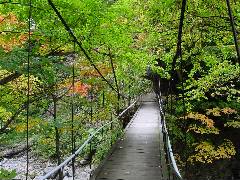 こんな雰囲気ある釣り橋を渡って到着です。 紅葉真っ盛りの頃だとさぞきれいなんでしょう。 少し早かったかな。 |