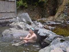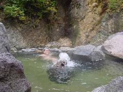 ここは実は女湯です。 日帰り客がいないのでだれもいなく、宿の人がせっかくだから入ったらと薦めてくれました。 混浴の露天の少し上流です。 |