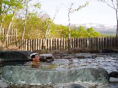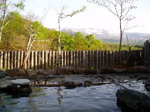 内風呂もなかなかですがここはやっぱり展望抜群の露天風呂でしょう。 新緑と残雪の栗駒の遠望に大満足です。 湯はかけ流しっぽく感じましたが・・・ |