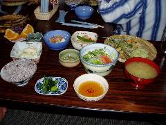 夕食はこのあたりで取れた食材にこだわってます。 岩魚・山菜のてんぷら・和え物・・・ ご飯は古代米(赤米)です。 |