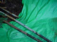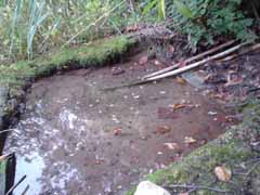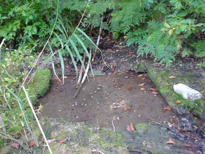 ありました。 湯船跡(?)です。 でも泥が堆積していてこのままでは入れそうにないです。 ちなみにスコップで掘っていくとなんとも言えない強烈な匂いが・・・メタンガスか??? |