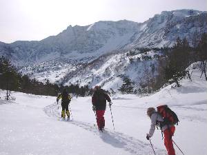 銅沼から中の湯方面へ上り返します。 ここではシールを貼ってひたすら歩きます。 最後の急斜面で皆スキーを脱ぐハメになりましたが無事到着。 |