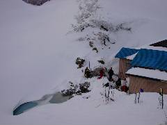 建物の影で遅い昼食です。 本来ならこの脇でぼこぼこ湯が沸いていたのですが雪で埋まっています。 |