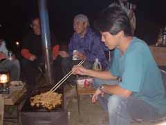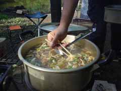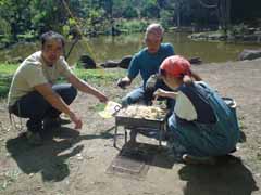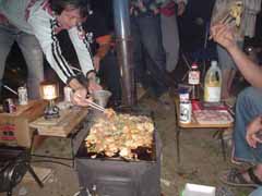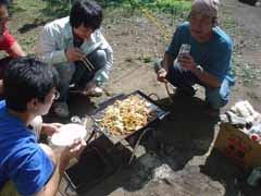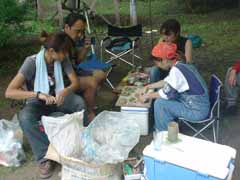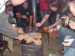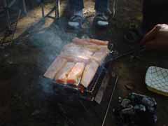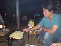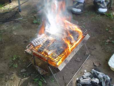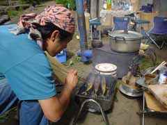 前日は昼まで予定を決めかねて出発したのが夕方。 塩尻のこのキャンプ場に着いたときは真っ暗。 もう宴会も盛り上がっていました。 晩の写真は撮り忘れました。 で翌朝、朝ごはんです。 秋刀魚を焼いてくれているのが主催者のMさん。 今年は料理長不在なので彼がみんなの食事を作ってくれました。 |