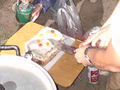 なんとこの数週間前に入籍したというカップルのためここでケーキが登場。 ナイフというか包丁でケーキ入刀です。 |