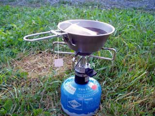 ティーバッグ式のコーヒーで目覚めの一杯。 このガスストーブすでに18年選手となりました。 まだ使ってる人います? |
