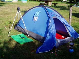 綺麗に晴れて気持ちのいい朝です。 三脚の上に付いているのは太陽電池で携帯電話の充電中です。 |