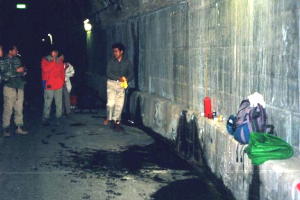大町高瀬ダムから湯俣へ行く途中2番目のトンネル内。 30℃弱の湯が沸いている。