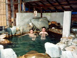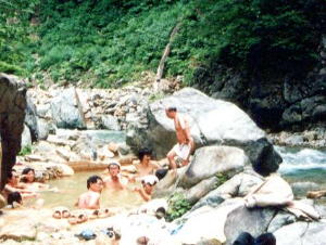 赤湯温泉へ到着です。 川沿いに温泉があります。 |