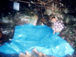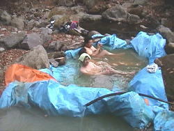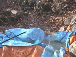 枝には営林署の何か目印でしょうか。 ちいさな看板がぶらさがっています。 ブルーシートに湯を溜めます。 |