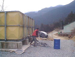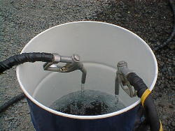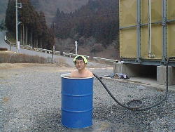 近くの側溝へ余り湯がドバドバと流れています。湯量は相当ありそうです。 ただし湯温は30℃以下みたいです。ここの温泉の特徴はうれしいくらいに強烈な硫化水素臭です。 ドラム缶に溜めて入浴です。 |