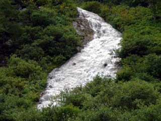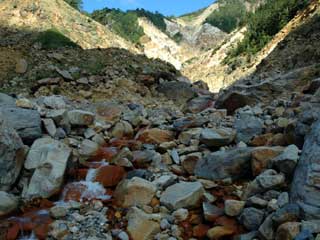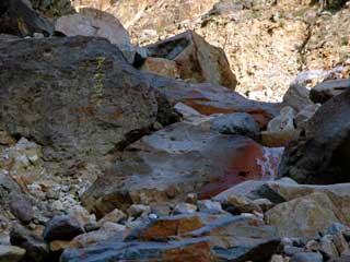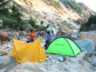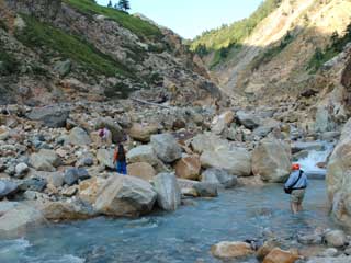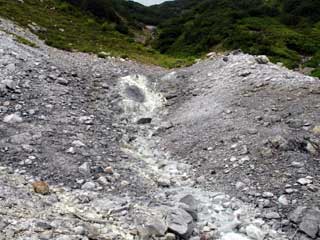 | 目的の沢とその東の沢との出合い。 右は通称出合の湯。緑が綺麗ですね。 とりあえず上流散策です。 ちなみにこの上部はガスセンサー鳴りっぱなし。(場所によっては推定100ppm以上!) 鳴りすぎて終いには電池が切れてしまいました。(何の意味もないってか???) 危ないなあ・・・ |