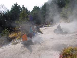 翌日は裏山の地獄で蒸し物に挑戦しました。あたり一帯が地熱地帯です。 |