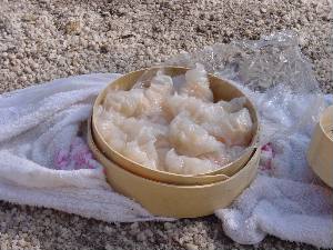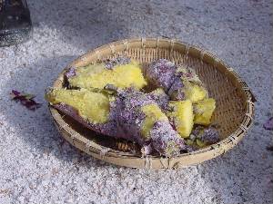 えび餃子は約20分で完成。 熱いまま手でつかみタレへつけていただきました。これは美味。 (知らなかった人ごめんなさいです。) サツマイモも見かけはちょっと・・・ですが焼き芋以上においしく感じました。野外での料理は雰囲気が調味料です。 この他ジャガイモも蒸しましたがみんな腹いっぱいで食えず、ねこまんまさんが持って帰りその晩、ポテトサラダになったそうです。 |