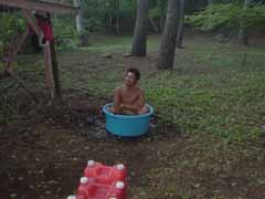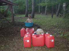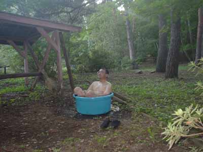 汲んできた湯をキャンプ場の邪魔にならないところでタライに入れて入浴です。 44℃くらいの源泉をここまで運んできて多少温度は下がりましたが快適入浴です。 2時間くらいは入浴可能でした。 |