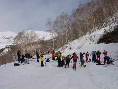 出発は栂池スキー場のトップからです。 今回はガイドさん任せのツアーです。 出発の場所は凄く混んでます。 これからこの他のグループと抜きつ抜かれつの登りになります。 なんとこの日は蓮華温泉は定員いっぱいの250人の客がいたとか??? 年間通して一番多い時期みたいです。 |