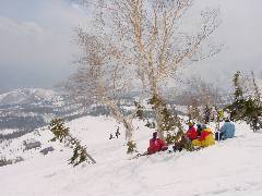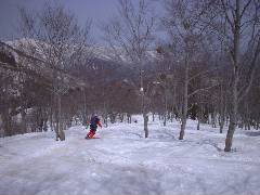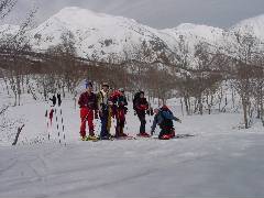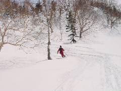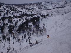 上部では新雪滑走が楽しめました。(ちょっと重かったけど・・・) 下に行くに従いどんどん重くなっていくのはこの季節仕方ないか・・・ |