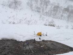上から見た仙気の湯です。 ツェルトを脱衣場所にしているグループもいました。 さすがに温泉の周りは雪がついていません。 |