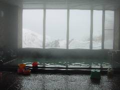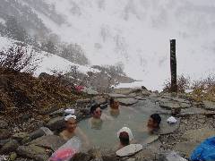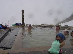 で、こちらの仙気の湯へ入湯。 気持ちよさそうに見えますがなんと温度34.6℃。 冷たい雪が降り、時たま雷も鳴っていました。 着替えには相当覚悟が必要でした。 |
